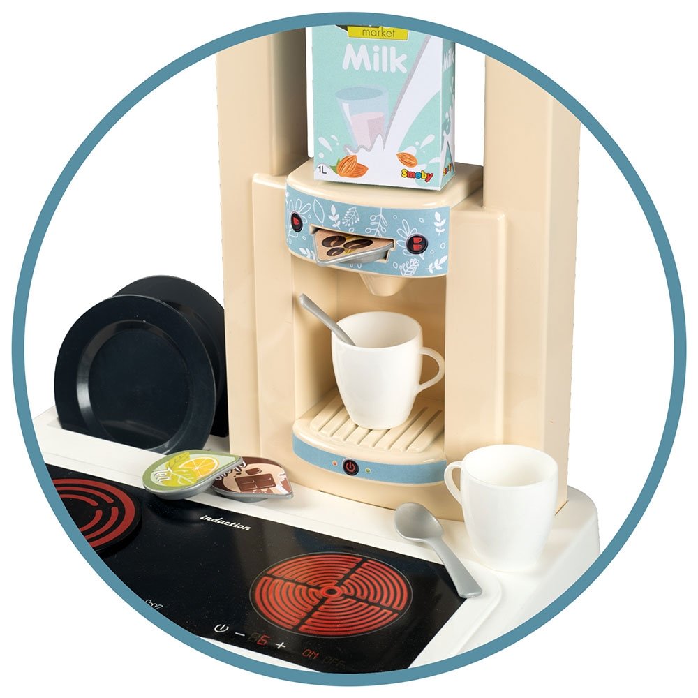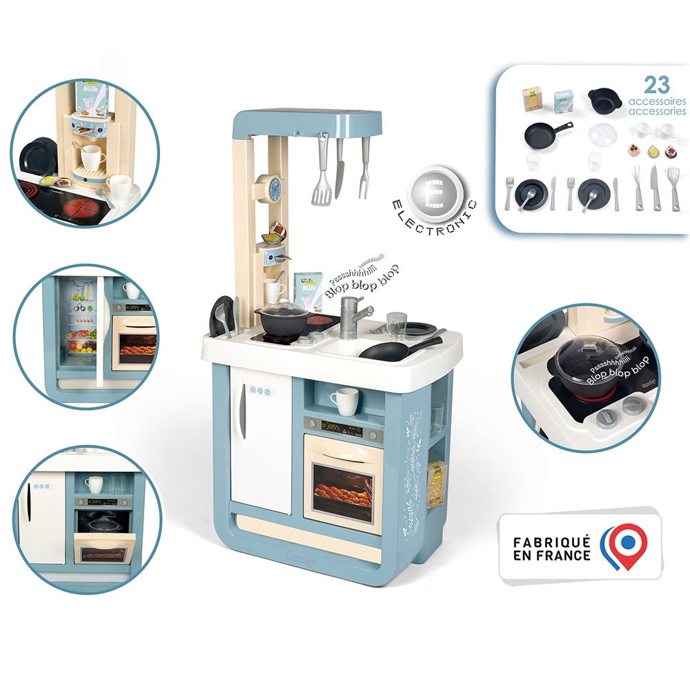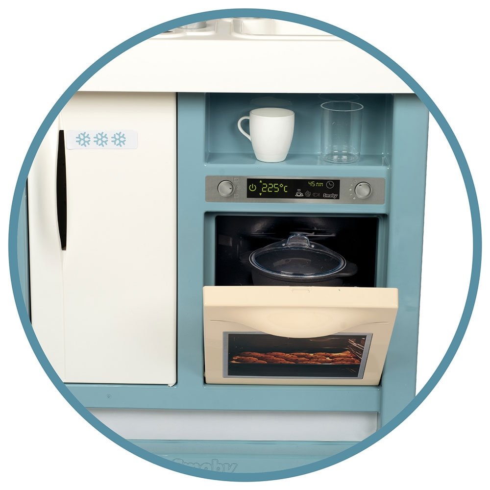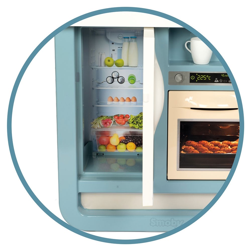 - Bucataria Smoby este dotata cu 23 de accesorii interesante. Printre aceste accesorii se regasesc: frigider la care se deschide usa, cuptor la care se deschide usa, plita (cu sunet specific “Blop-Blop”), chiuveta, expresor de cafea cu pastile, oala, tigaie, si alte accesorii
