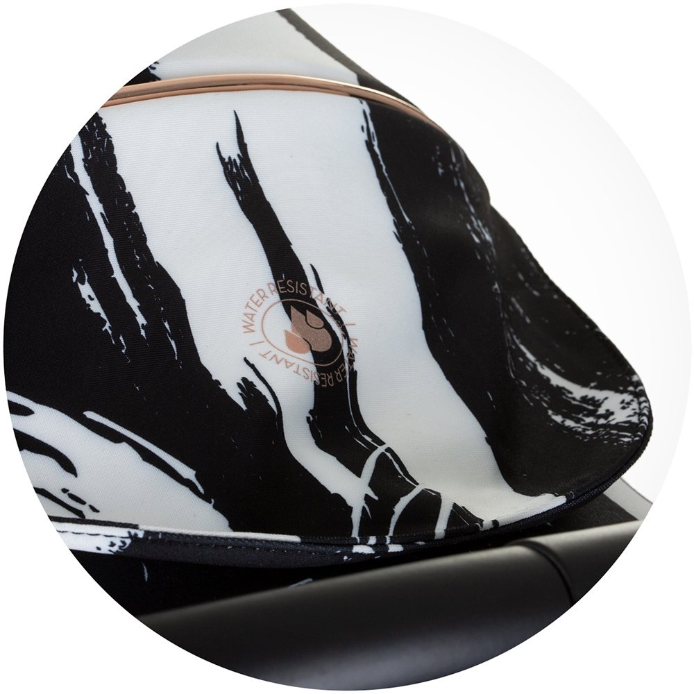 - Copertina generoasa si reglabila, dotata cu vizor si realizata din material impermeabil