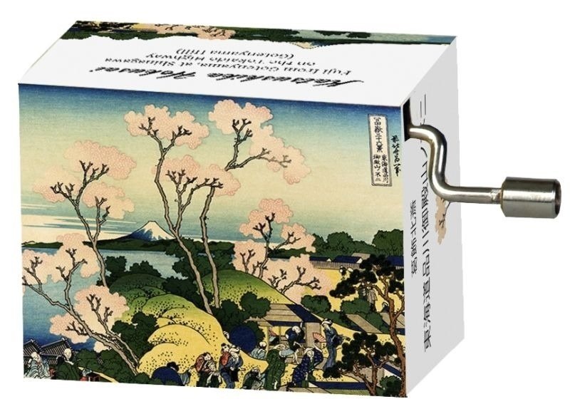 Mecanismul metalic exact calibrat este montat pe un lemn rezonant, iar cutia de carton este imprimată artistic cu ilustrații de flori de cireș în stilul celebrului artist japonez Katsushika Hokusai — o combinație rafinată între muzica europeană și estetica japoneză.