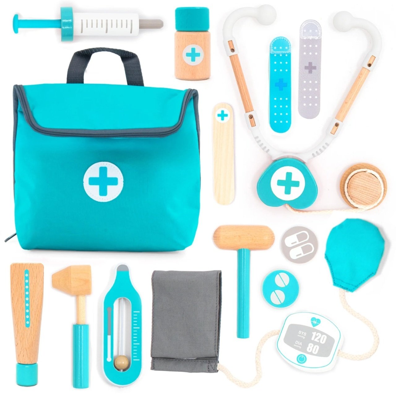 Stetoscopul se pune la urechi, manșeta tensiometrului se înfășoară pe brăț, seringa are piston care se mișcă. Nu sunt simple figurine colorate — sunt instrumente cu care copilul chiar face ceva. Și tocmai asta contează: când imită ce a văzut la cabinet, înțelege, procesează și data viitoare se duce la medic fără lacrimi.