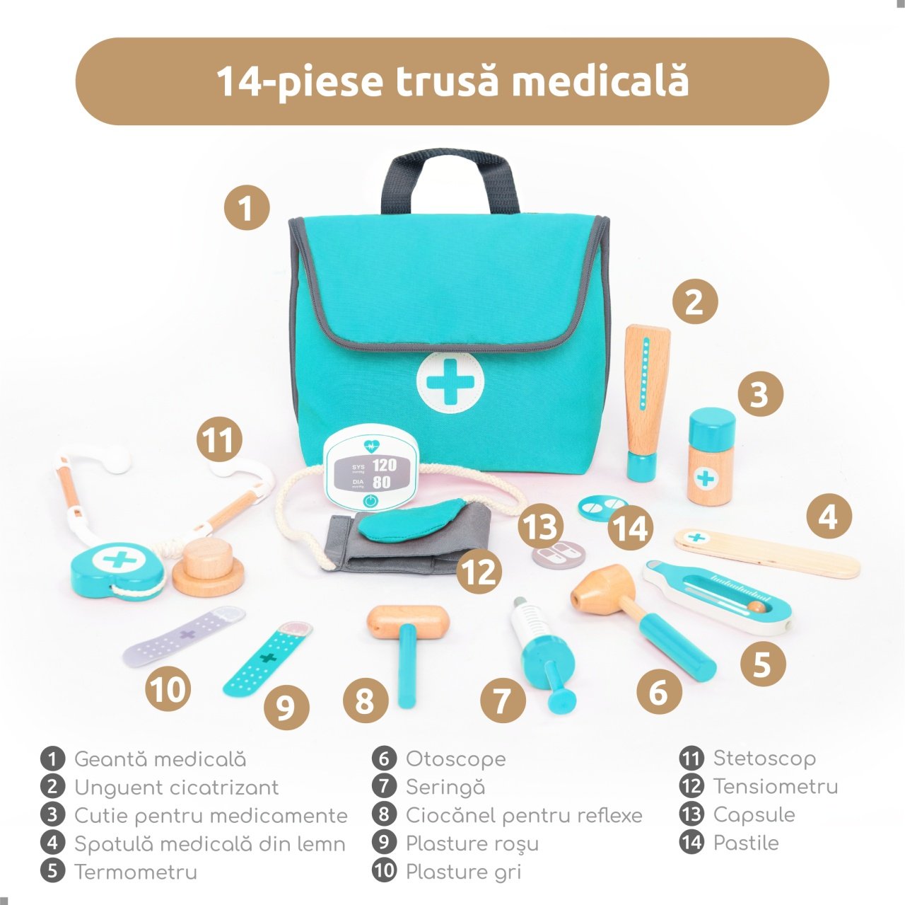 Știi cum e când cel mic vine acasă de la medic și a doua zi vrea să fie el doctorul? Trusa medicală mini UMU® este exact ce are nevoie — un set cu 14 instrumente din lemn cu care poate deschide propriul cabinet.