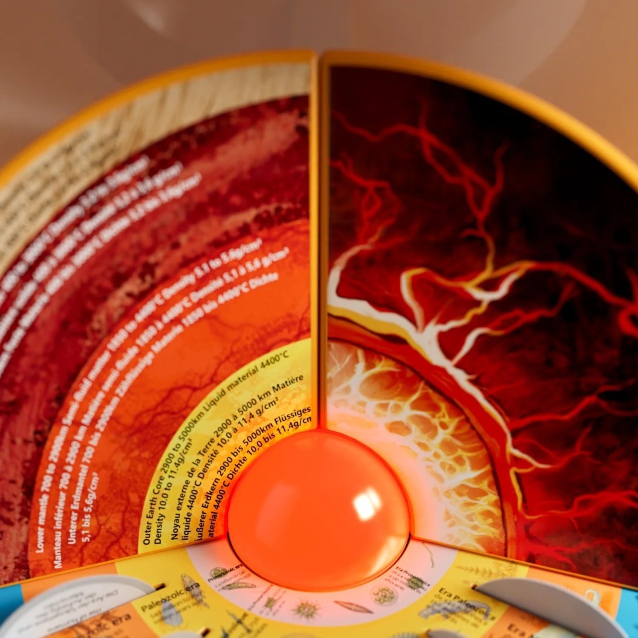 Glob educațional interactiv Pamantul – Descoperă misterele planetei noastre! Pentru micii exploratori, acest glob 3D le permite să descopere continentele, straturile Pământului, fosilele și epocile geologice prin jocuri, lumini și carduri interactive. Globul se deschide pentru a dezvălui straturile interne ale Pământului , cu o lumină centrală care simulează nucleul fierbinte. Este prevăzut cu 12 carduri ilustrate (dublu față) , peste 66 de informații educative și un mod chestionar cu 48 de întrebări pentru testarea cunoștințelor. Funcția de autocontrol le permite copiilor să verifice singuri răspunsurile, iar modul „enciclopedie” oferă explicații audio clare, captivante și ușor de înțeles. Redare vocală diponibilă doar în limbile engleză și franceză. Un joc STEM recomandat pentru școală sau acasă. Combină distracția cu învățarea! Cadou ideal pentru copiii curioși, pasionați de știință. Conține: Glob interactiv „The Earth” 2 × Piese detașabile ale scoarței terestre 6 × Carduri mari cu dublă față 6 × Carduri mici cu dublă față Bază cu funcții interactive (audio, quiz, lumină) EN/FR Necesită 3 baterii AA-1.5V (nu sunt incluse). Dimensiune produs: 24,4 × 20 × 44 cm Vârstă recomandată: +6 ani Confecționat din ABS. Conform reglementarilor EN71&ASTM. AVERTISMENT : Contraindicat copiilor sub 3 ani, conține piese mici. Se recomandă supravegherea copilului de către un adult în timpul jocului. Citiți instrucțiunile înainte de utilizare, urmați-le și păstrați-le pentru referință. Produs in China de TopBright Wisdom Information Technology pentru Topbright Gmbh, Germania Manual Joc STEM Glob pamantesc interactiv, TopBright – descarca aici fisierul