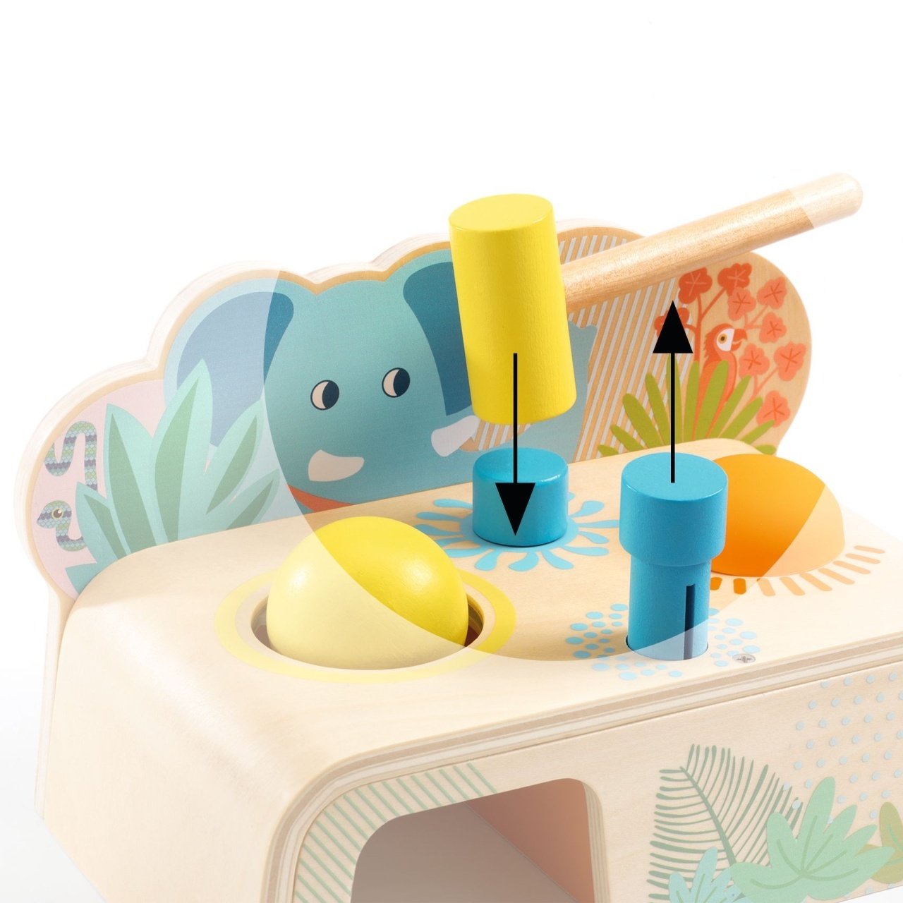 Jucarie bebe din lemn Multi Tap Multi Tap este o jucărie din lemn ingenioasă, care îi invită pe cei mici să descopere trei moduri diferite de a folosi ciocanul. Copiii pot lovi bila pentru a o face să alunece prin fantă, pot bate într-un cilindru albastru pentru a-l vedea pe celălalt sărind în sus, sau pot lovi în ciupercă pentru a declanșa un amuzant sunet de claxon. Jucaria bebe Multi Tap face parte din gama Multi de la Djeco, o colecție de jucării concepute pentru a le arăta copiilor cum pot realiza aceeași acțiune în moduri diferite, stimulându-le curiozitatea, coordonarea și plăcerea de a experimenta. Este recomandată pentru dezvoltarea motricității fine și a coordonării mână–ochi. Conținutul setului jucărie din lemn pentru ciocănit, cu 4 piese și un ciocan. Dimensiuni produs: 22 x 13.5 x 13 cm Vârsta recomandată: +18 luni. Confecționată din lemn certificat FSC®, cu vopsele non-toxice. Conform reglementărilor EN71&ASTM. AVERTISMENT: A se folosi sub directa supraveghere a unei persoane adulte. Producător: Djeco , Franța