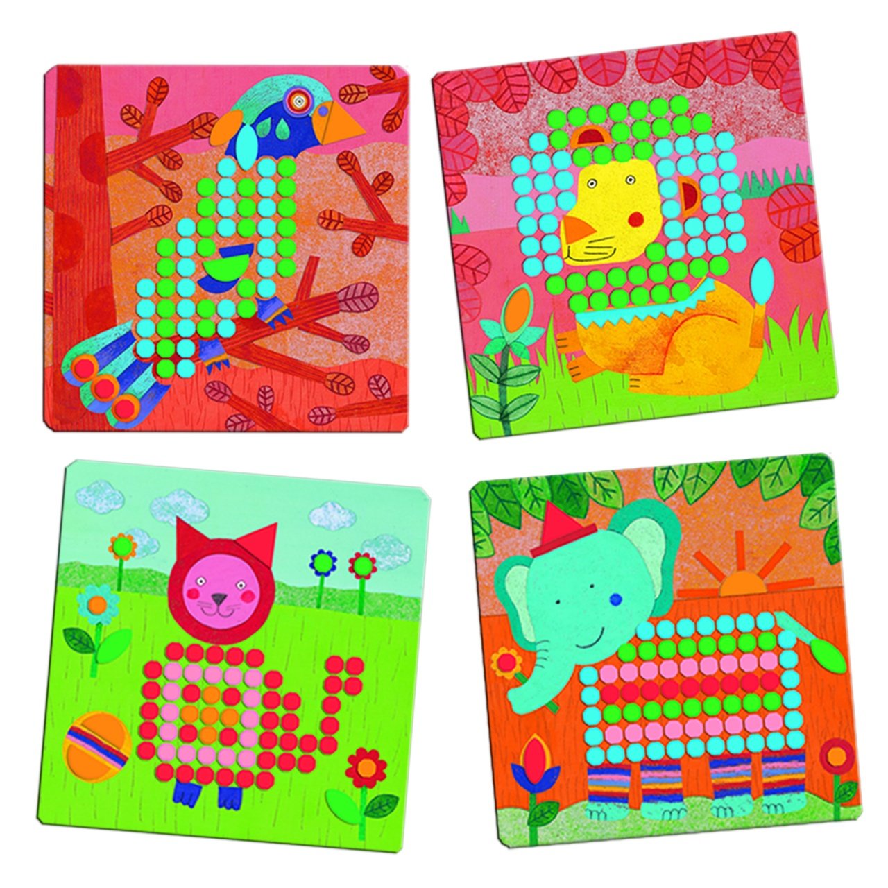 Mozaic animo Un joc inventiv de mozaicuri – creează imagini minunate completând cu pionezele colorate cele 8 modele. Imaginile sunt dezvăluite când toate pionezele sunt la locul lor. Pe lângă pionezele standard, sunt incluse și unele mari în forme noi, distractive, pentru a face rezultatul final să arate și mai frumos. Opţiunile de aranjare a pieselor sunt nelimitate! Dezvoltă manualitatea, răbdarea și creativitatea. Include o cutie de depozitare cu compartimente pentru diferite culori. Disponibil și în altă variantă (DJ08136 Mosaïco Rigolo) și ca versiune special concepută pentru copiii mai mici (DJ08140 Primo Mosaïco) Conținut: 1 tablă de lemn, 8 planșe cu animale, 8 șabloane (4 cartonașe cu două fețe), 230 de pioneze colorate. Vârsta recomandată: +4 ani. Confecționat din hârtie și carton certificate FSC®, materiale non-toxice, conform reglementărilor EN71&ASTM. AVERTISMENT: Contraindicat copiilor mai mici de 3 ani, conţine piese mici, pericol de sufocare. A se folosi sub directa supraveghere a unei persoane adulte. Producă tor: D jeco , F ranța