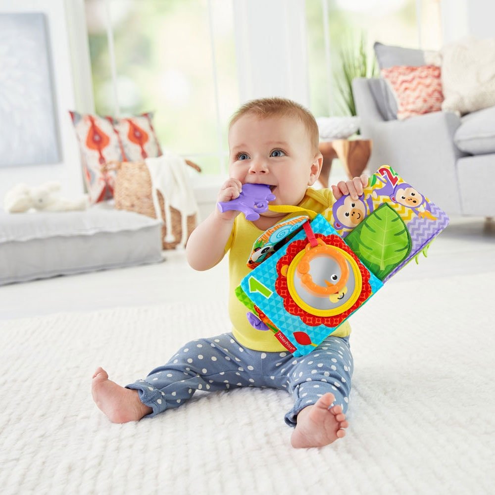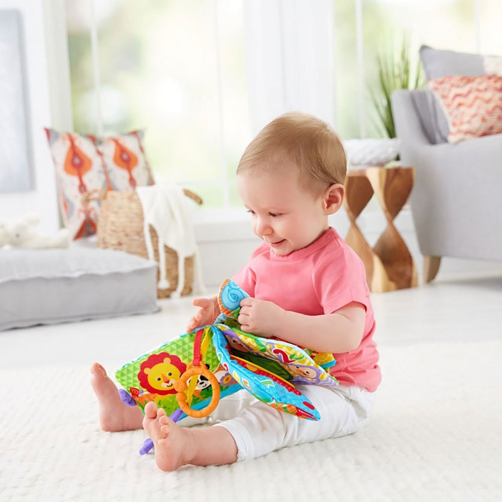 - Bebelusului tau ii va placea aceasta carte moale cu activitati cu o surpriza pe fiecare pagina: un scartait ascuns, o oglinda pentru auto-cunoastere, o maimutica acrobata sau clapeta atasata