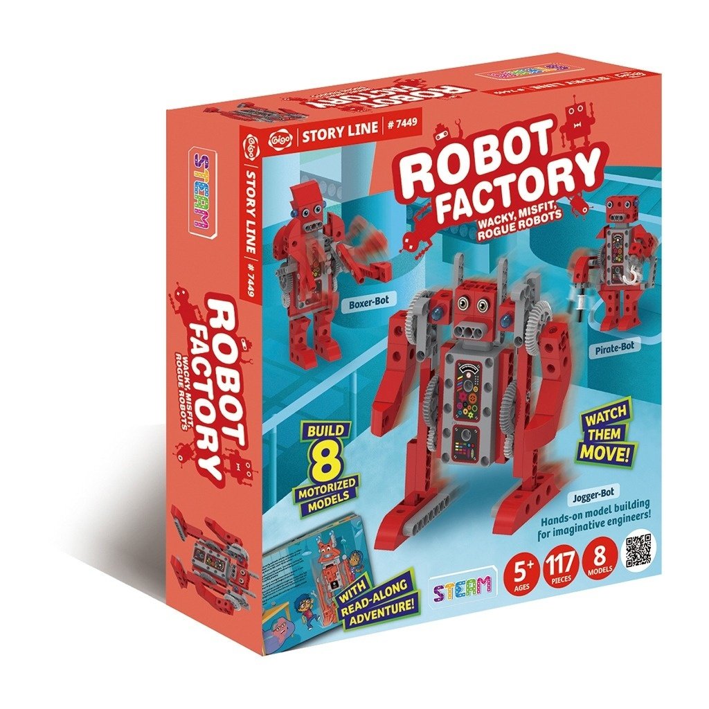 Kit STEM Primii pasi – Fabrica de roboti Construiți o serie de roboți motorizați și puțin nebuni cu acest kit introductiv de inginerie mecanică pentru copii cu vârste începând de la 5 ani. O carte de povești frumos ilustrată cu 32 de pagini se concentrează în jurul aventurilor familiei Omegas – familia de creatori și ingineri prezentă în toate kiturile de inginerie timpurie Kids First (Primii pași). Această poveste duce personajele la o fabrică de roboți în care roboții au scăpat puțin de sub control. Unul câte unul, roboții sunt reparați și puși din nou în stare de funcționare. Pe măsură ce urmăresc povestea, copiii pot construi opt modele de roboți și pot experimenta cu ei pentru a vedea cum folosește fiecare dintre ei motorul alimentat cu baterii, angrenajele și alte piese mecanice. Fiecare robot își mișcă brațele sau picioarele într-un mod diferit, creând comportamente amuzante de mers și de mișcare și, de asemenea, învățându-i pe copii cum funcționează sistemele mecanice simple. Piesele de construcție mari și cubice din plastic facilitează asamblarea modelelor pentru mâinile mici. Setul Fabrica de roboți oferă o modalitate atractivă de a preda concepte simple de inginerie copiilor mici, permițând adulților să pună bazele unor abilități solide legate de STEM și de înțelegere la o vârstă fragedă. Construirea modelelor și experimentele dezvoltă abilitățile de motricitate fină, abilitățile de inginerie mecanică, abilitățile vizuale-spațiale, precum și abilitățile de raționament și de dezvoltare a conceptelor. Conține 117 piese, 8 modele, manual cu instrucțiuni. Necesită 2 baterii AA / LR06 (nu sunt incluse) Confecționat din plastic. Conform reglementarilor EN71&ASTM. AVERTISMENT: Contraindicat copiilor sub 3 ani, conține piese mici. Se recomandă supravegherea copilului de către un adult în timpul jocului. Citiți instrucțiunile înainte de utilizare, urmați-le și păstrați-le pentru referință. Produs in Taiwan de Genius Toy. Manual Kit STEM Fabrica de roboti, Gigo Toys – descarca aici fisierul
