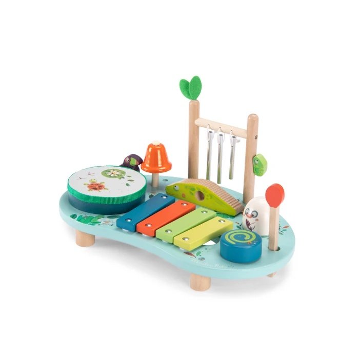 Masuta muzicala cu activitati multiple Această măsuță muzicală din lemn in culorile junglei este un centru de activități complex, conceput pentru a trezi geniul muzical din fiecare copil. Bebelușul poate folosi bagheta pentru a bate toba de pe iaz, pentru a zgâria spatele crocodilului, pentru a cânta la xilofonul colorat, pentru a se juca cu oul zornăitor și chiar pentru a face clopoțelul să sune la atingerea ciocului tucanului! Cu un design vibrant și ilustrații exotice, jucăria invită micii exploratori să descopere ritmuri, sunete și texturi diferite. Continut: Toba Xilofon colorat Clopotei de vant Guiro (element zimțat) sub forma de crocodil Maracas detașabil sub formă de ou Clopotel cu tucan Bagheta din lemn pentru toba Beneficii: Stimulează dezvoltarea senzorială și auditivă Dezvoltă motricitatea fină și coordonarea mână-ochi Încurajează explorarea și curiozitatea prin joacă interactivă Introduce primele concepte muzicale și ritmice Design colorat și tematic, potrivit pentru copii Dimensiuni: 33 x 10.5 x 22 cm Vârsta recomandată: +2 ani. Material: MDF, placaj, lemn de schima, poliester, fier, plastice PE-PP-ABS, cerificate FSC®. AVERTISMENT: Contraindicat copiilor sub 3 ani. A se utiliza strict sub supravegherea unei persoane adulte. Producător Moulin Roty, Franța.