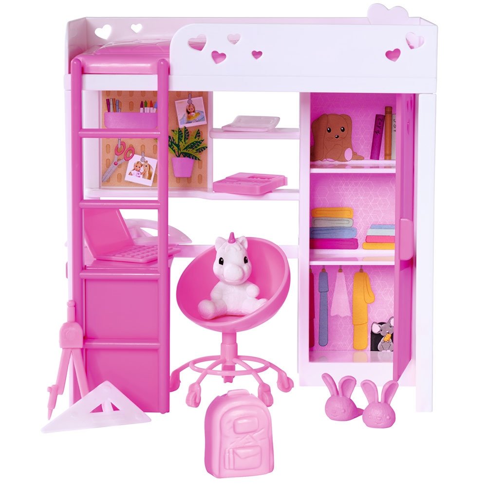- Evi are o camera organizata, cu un pat inalt, sub care se afla un birou si un dulap si o multime de accesorii
