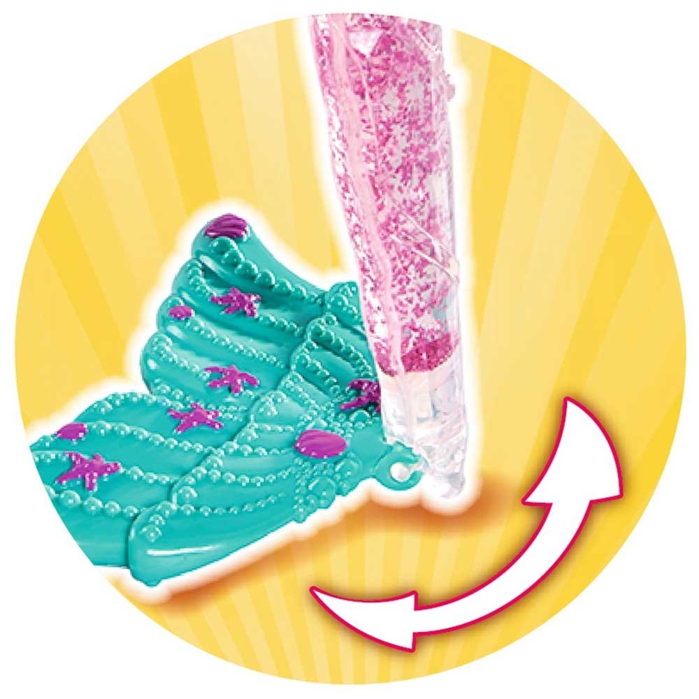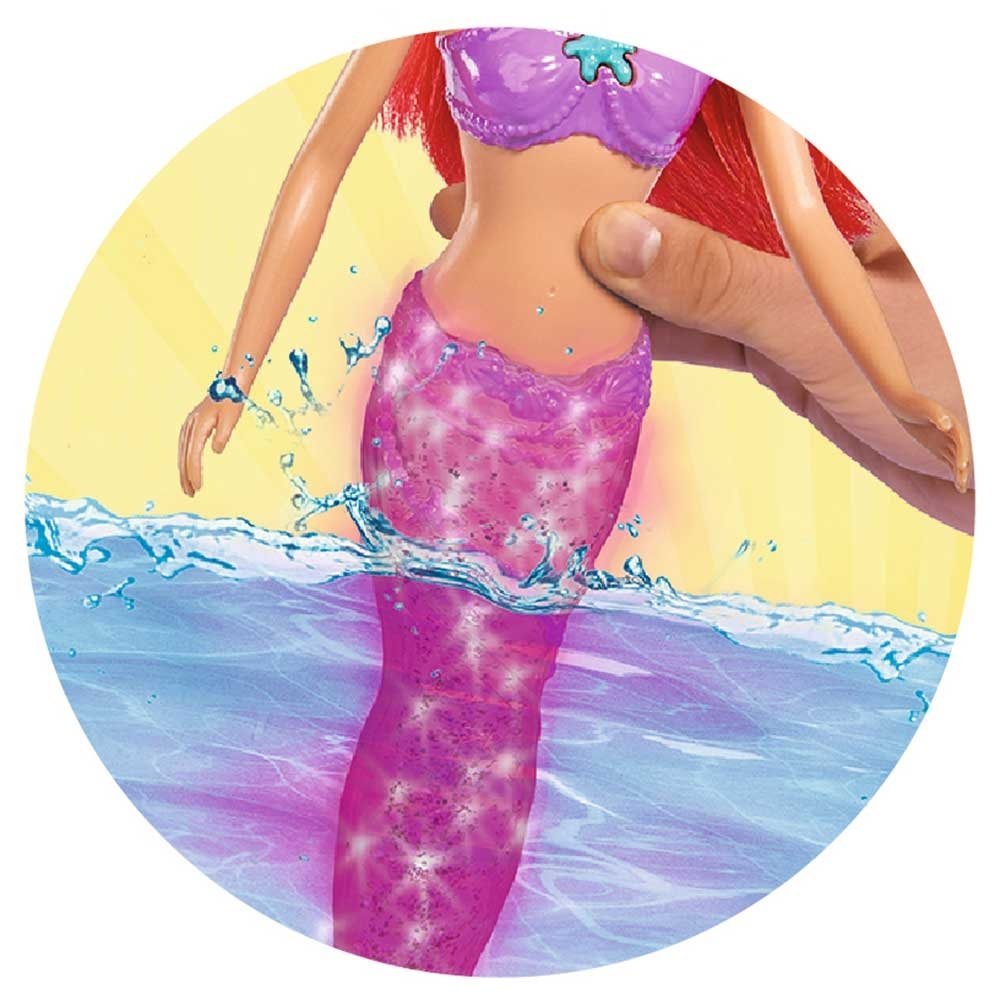 - Daca agitati coada sirenei incepe sa straluceasca si daca apasati steaua de pe colier papusa incepe sa straluceasca