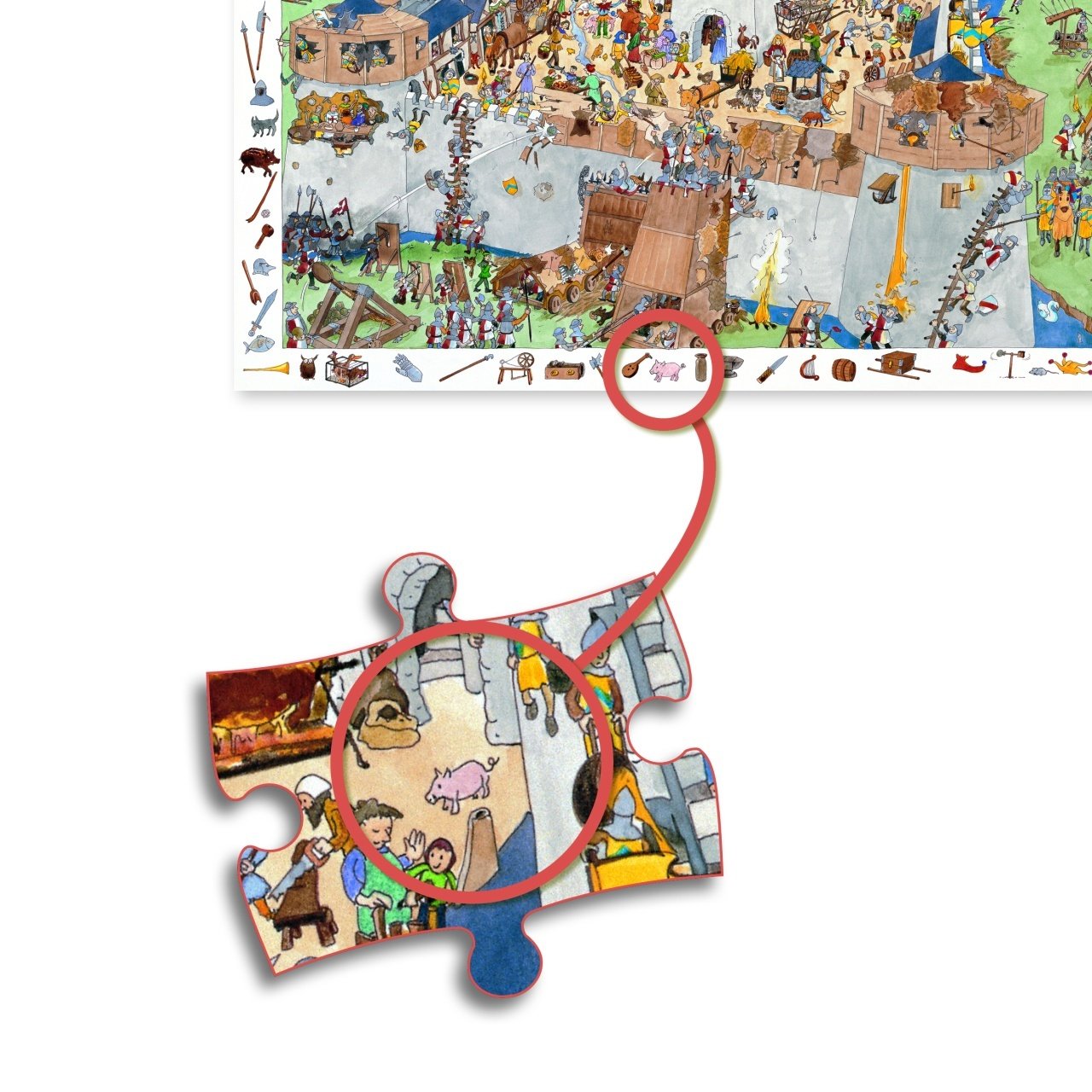 Puzzle observatie Fortareata Un puzzle de observație cu tema medievală, format din 100 de piese. Aruncă o privire la modul în care trăiesc… până când castelul este atacat. Copiii realizează puzzle-ul, apoi se distrează găsind elemente din chenarul din imaginea principală. Descoperiți o lume frumoasă prin ilustrații bogate și detaliate, care sunt pline de surprize. Conține un poster de dimensiunea puzzle-ului pentru a fi folosit ca referință. Puzzle și joc de observație: găsește în imaginea puzzle-ului elementele afișate în chenar. Ce contine : puzzle din carton 100 piese poster Beneficiile jocului: Dezvoltă atenția și concentrarea Coordonare mână-ochi și motricitate fină Socializare și joacă în familie Dimensiune puzzle asamblat: 61 x 38 cm. Vârsta recomandată: +5 ani. Confecționat din carton și hârtie certificate FSC. AVERTISMENT: Contraindicat copiilor sub 3 ani! Poate conține piese mici, pericol de sufocare. Se recomandă supravegherea copilului de către un adult în timpul jocului. Producător: Djeco, Franța. Fabricat în Europa.
