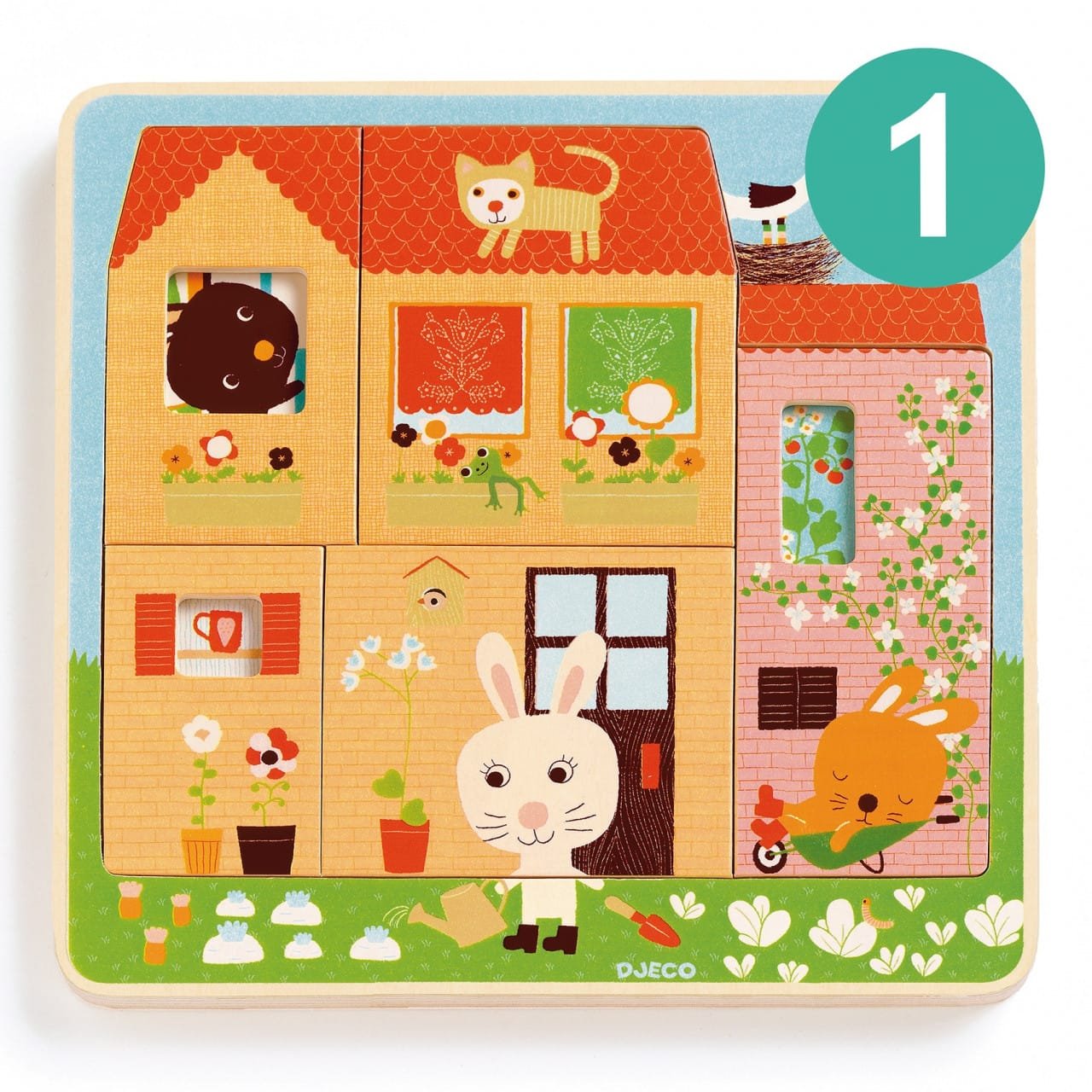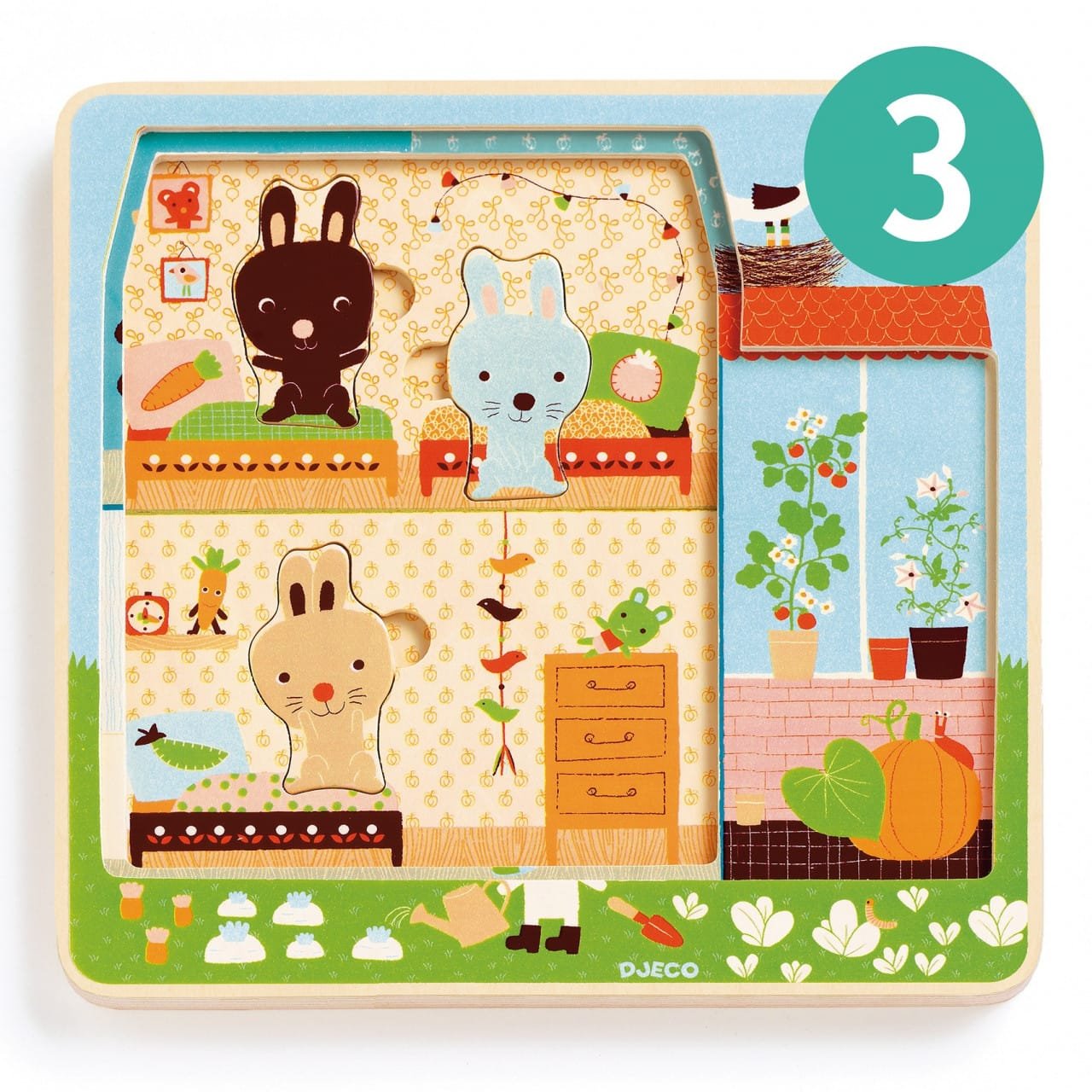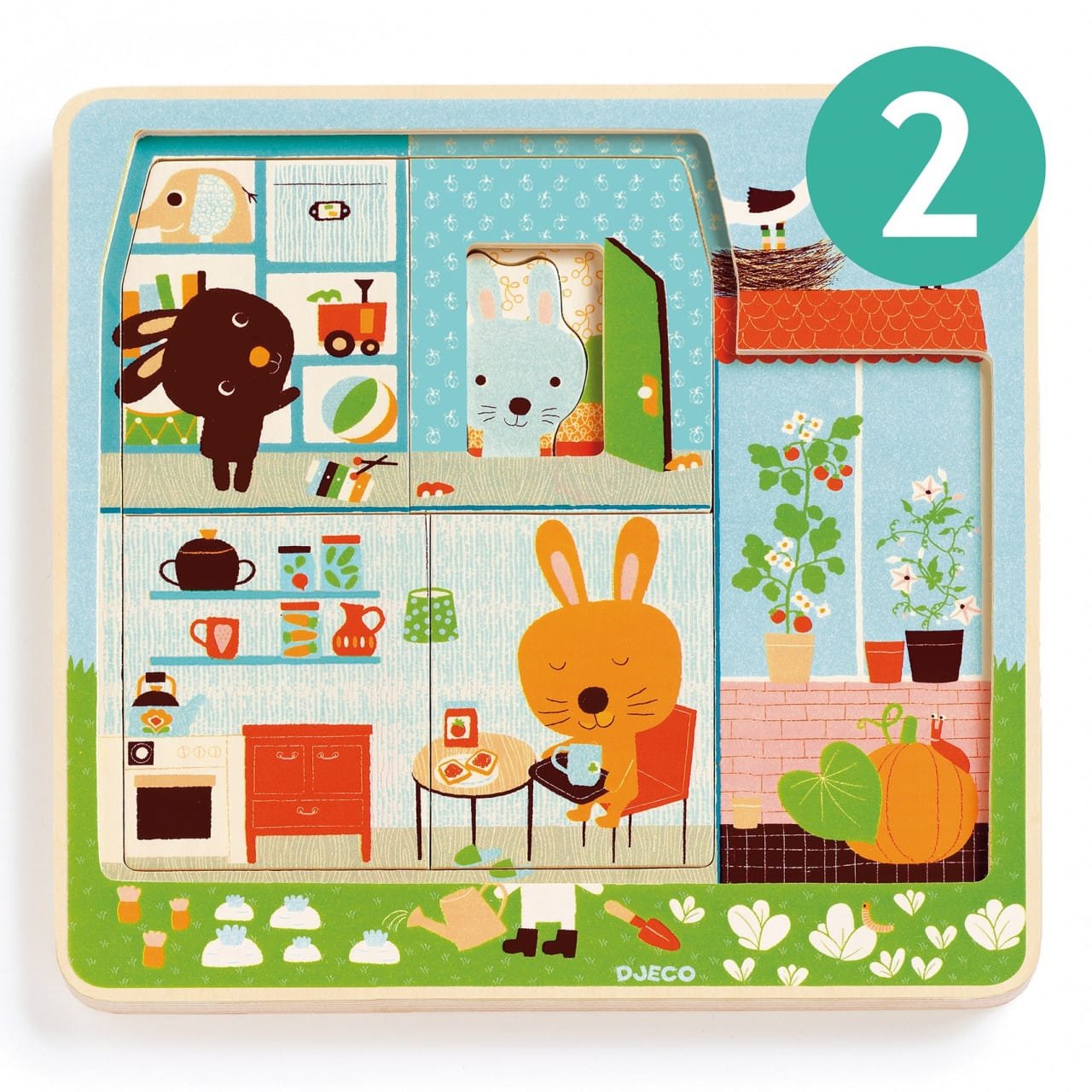Puzzle straturi casuta iepurasilor Chez-Carrot este un puzzle din lemn cu 3 straturi și 12 piese. Pe măsură ce copiii potrivesc piesele, și completeză fiecare nivel, se conturează o imagine a casei familiei de iepurași. Piesele mari sunt ușor de manevrat de către cei mici. O activitate care stimulează concentrarea și logica celor mici. Ilustrații colorate și detaliate pe fiecare strat. Cutie colorată, premium, ușor de depozitat. Fiecare strat are o culoare diferită, pentru a fi mai ușor pentru copii să separe piesele pentru fiecare imagine. Continut: puzzle din lemn cu 3 straturi. Stratul 1: 4 piese Stratul 2: 3 piese Stratul 3: 2 piese. Vârsta recomandată: + 2 ani. Dimensiune produs: 25 x 25 x 1.6 cm. Confecționat din lemn, cu vopsele non-toxice, conform reglementărilor EN71&ASTM. AVERTISMENT: Contraindicat copiilor sub 2 ani, conține piese mici, pericol de sufocare. A se utiliza sub directa supraveghere a unui adult. Producător: Djeco , Franța.