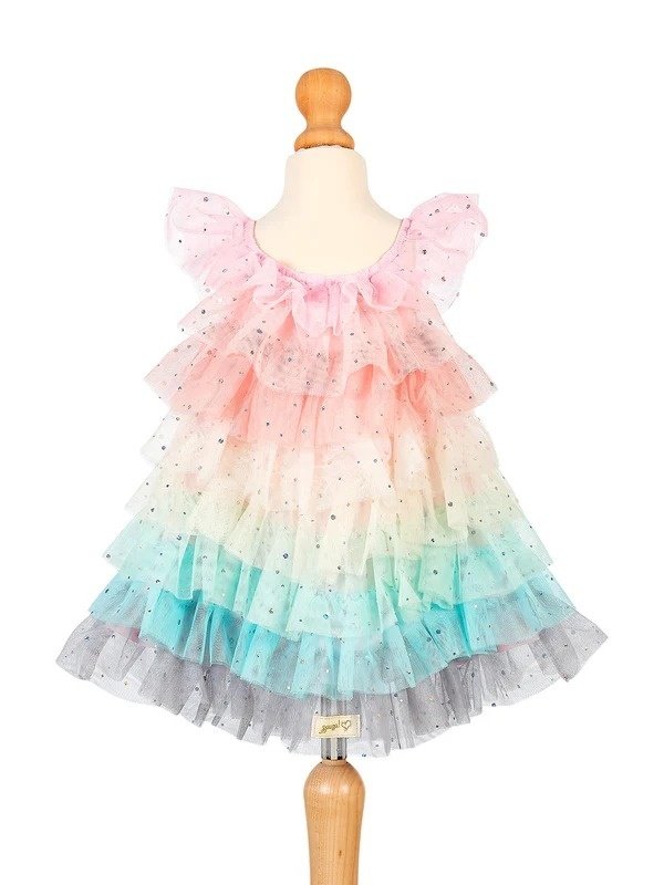 Rochie din tul 100% poliester cu volane suprapuse în degradeu curcubeu: roz pal, piersică, galben, mint, turcoaz și gri la bază. Fiecare volan are strasuri mici presărate pe toată suprafața, care creează un efect sclipitor la mișcare. Mânecile tip fluture din tul roz pal completează silueta vaporos-festivă.