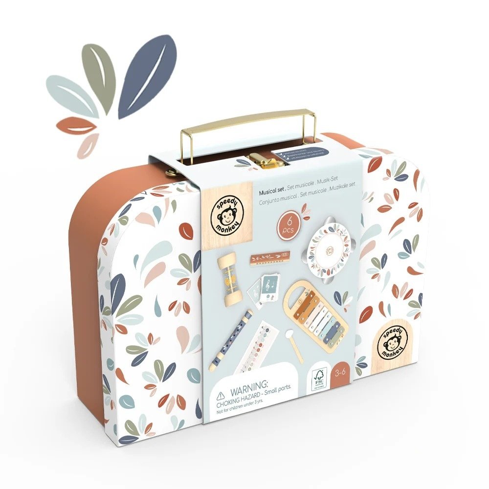 Set 5 instrumente muzicale in valiza Pentru că muzica stimulează toate zonele esențiale ale dezvoltării copilului – de la creativitate până la percepția senzorială – acest set muzical este alegerea completă pentru micii artiști! Setul include 5 instrumente muzicale: Xilofon cu opt clape metalice colorate, tamburina cu sunet ritmat și moale, rainmaker-ul din lemn care recreează sunetul moale al ploii atunci când mărgelele cad în cascadă în timp ce rotiți instrumentul, flaut, muzicuța. Toate instrumentele sunt potrivite pentru începători, nu este necesară experiență. Ambalat în valiză de carton decorativă, potrivită pentru cadou. Vârsta recomandată: +3 ani. Fabricat din lemn provenit în mod durabil din păduri certificate FSC® și acoperită cu vopsea netoxică fără gust și fără miros. AVERTISMENT: Contraindicat copiilor sub 3 ani. A se folosi sub atenta supraveghere a unui adult. Producător: Speedy Monkey
