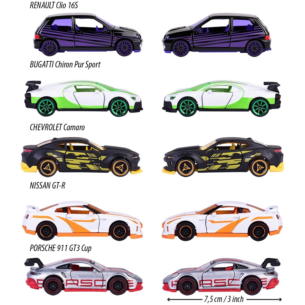 - Setul include: Renault Clio 16S in negru, ;Porsche 911 GT3 Cup in gri, Nissan GT-R in alb, Bugatti Chiron Pur Sport in alb, Chevrolet Camaro in negru
