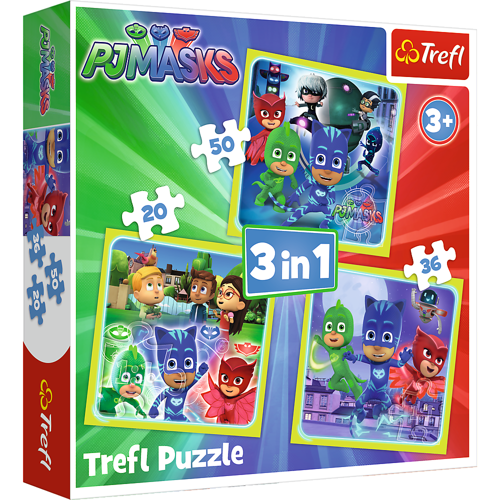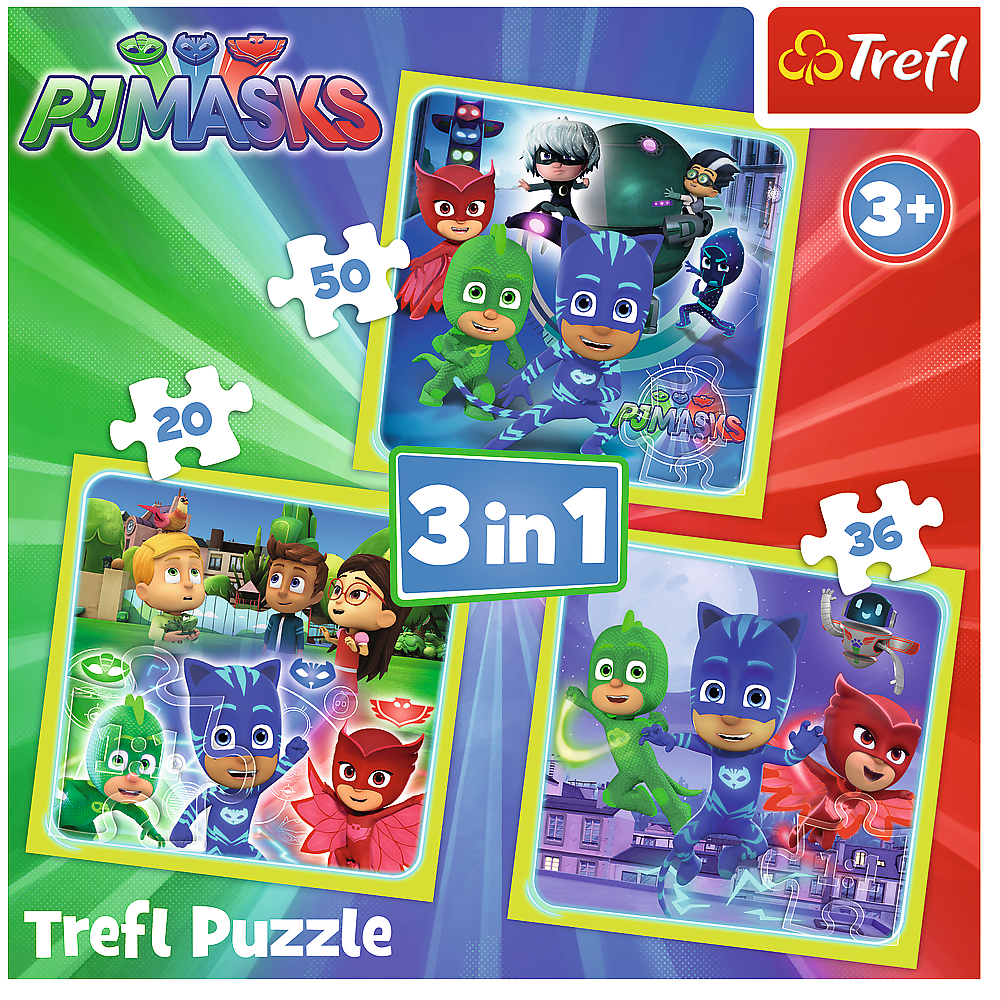 Detalii Set puzzle 3 in 1 Trefl Eroi in Pijama, Gata de actiune, 1×20 piese, 1×36 piese, 1×50 piese
